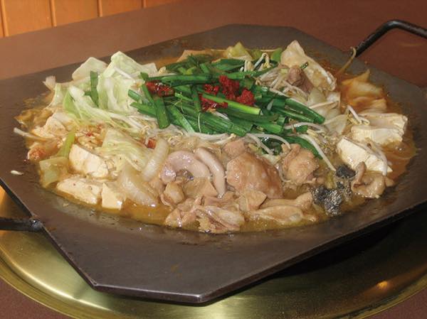 通常、ホルモン鍋(もつ鍋)は出汁にホルモンと野菜を入れて食べるものですが、田川ホルモン鍋は焼き肉のタレで下味をつけたホルモンと玉ねぎ、キャベツ、もやし、ニラなど大量の野菜を、真ん中が窪んだ独特の形の鉄板で炒め煮する田川のご当地グルメです。作り方はシンプルで味付きホルモンを鉄板で炒め、野菜を投入し、上から綴じ蓋をし、野菜から水分が染み出してきたところで上からタレ(自宅でやる場合は焼肉のタレで代用可)をかけて完成です。蒸し焼きにすることで野菜の甘みが引き立ち、にんにくの効いたタレとホルモンとの相性抜群でご飯が進みます。