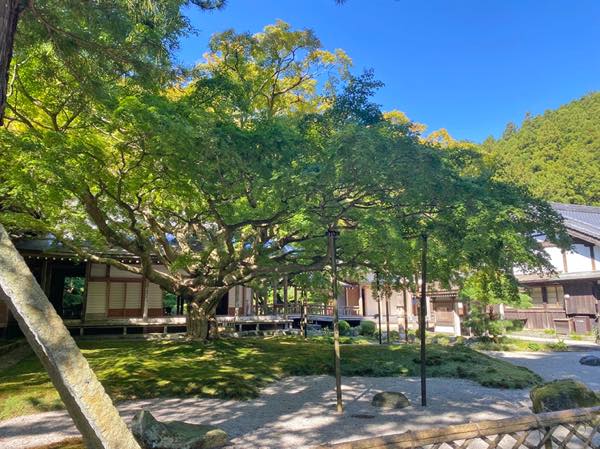 千如寺は西暦725年に清賀上人によって開創したと伝えられています。境内に入ると、見事な砂紋の和庭園があり、中央でひときわ存在感を放つのが樹齢約400年の大楓です。