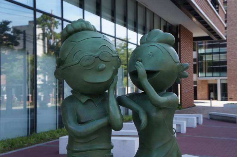 ※銅像横の案内には、長谷川町子さんが西南学院の近くに住んでいた時のエピソードが書かれています。
